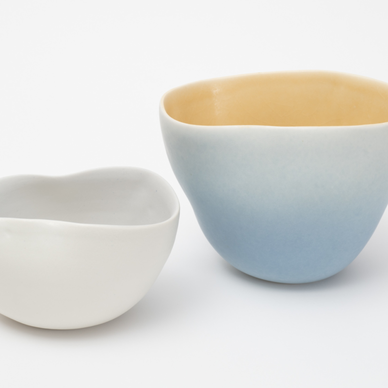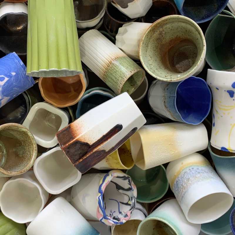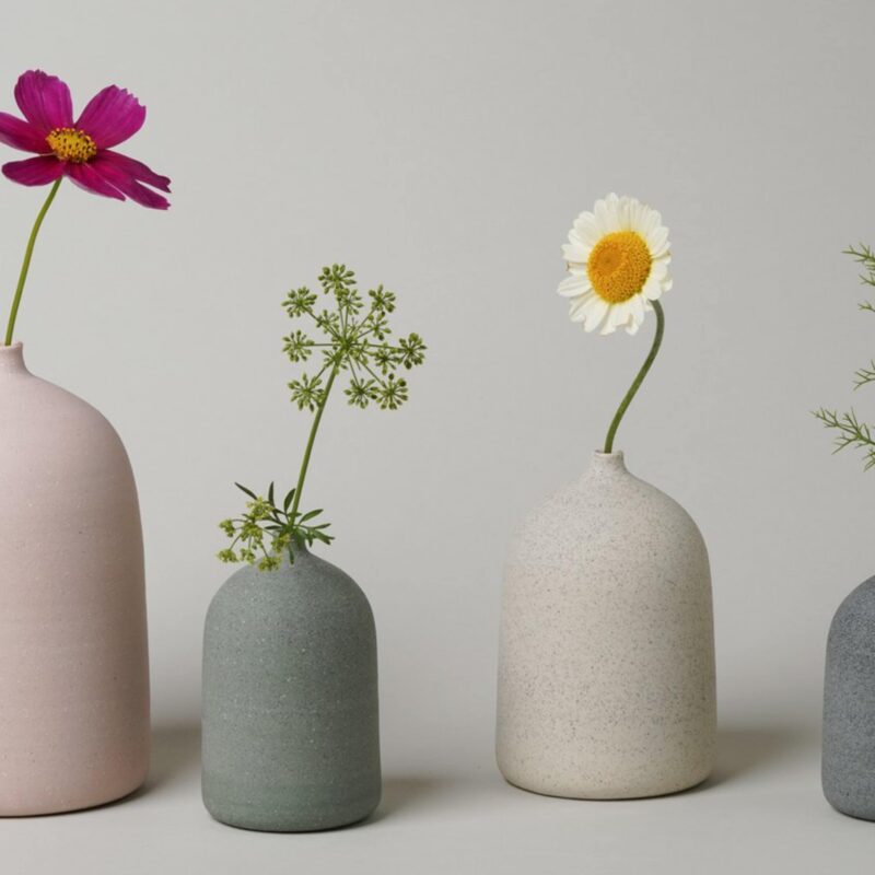Puddle-shaped grey ceramic vases on mirrored surfaces with grass mimicking the skips of a skipping stone on water. Image by Matthew Vrettas for Ghost Wares